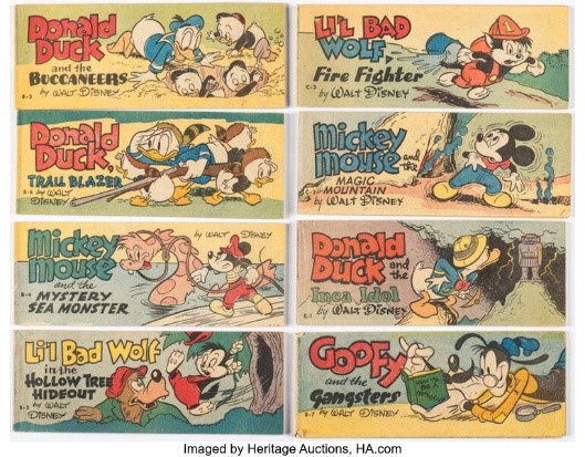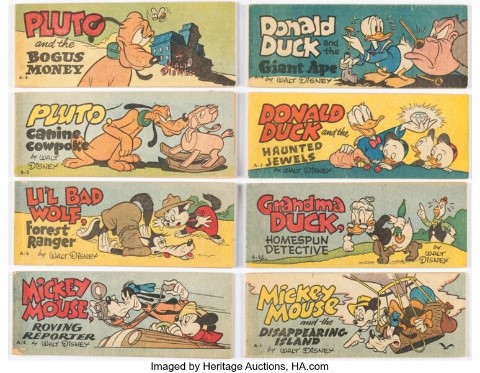 Wheaties (Premiums) Group of 28 (Walt Disney Productions, 1950-51) Condition: Average FN. This group includes A1-6, A8, B2-7, C1-3, C5, C6, C8, D1-4, D5 (two copies), and D6-8. Comes with two of the original mailing envelopes as well as five mailing envelopes for Cheerios Premiums that are not included, all of which have heavy wear and tears. Approximate Overstreet value for group = $600.